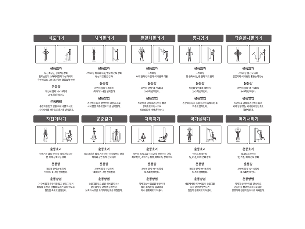 파도타기+허리돌리기+큰활차돌리기+등지압기+작은활차돌리기+자전거타기+공중걷기+다리펴기+역기올리기+역기내리기